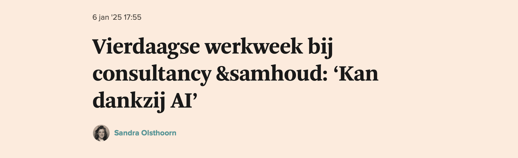 The numbers ended up being real. 85% daily adoption. 2.5 hours saved per person per week. Enough that the board moved the whole company to a four-day work week, full salary. I didn't make that decision. But the time savings from this work made the business case for it. The Financieele Dagblad and Consultancy.nl wrote about it. Microsoft recognised the approach as a best practice case. And a Stanford GSB professor is writing about &samhoud for a course on AI and organisations. That last part still surprises me.